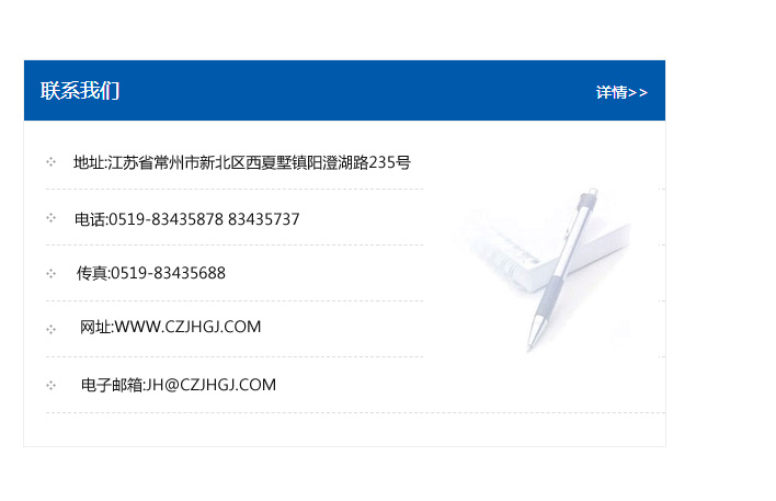 地址:常州市新北區友邦商務大廈1幢16、17層  電話:0519-85101652  傳真:0519-85112595  郵編:213022  網址:www.cz-jiayue_cn.haoliou.com  郵箱:xiajifengaa@163.com